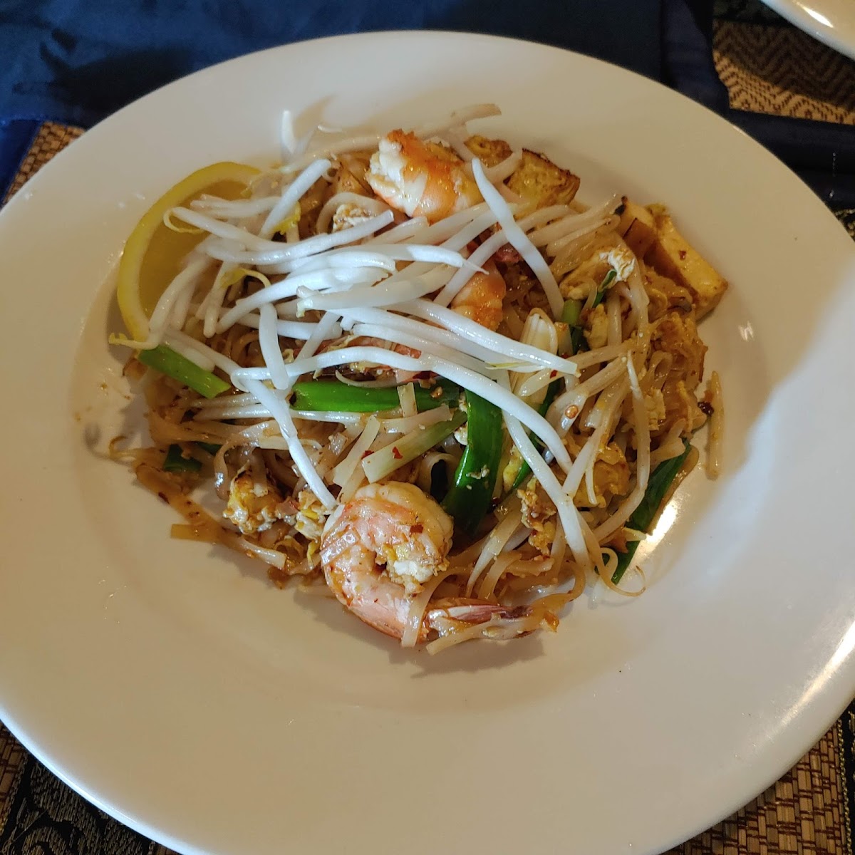 Stir fried thin thai rice noodles with egg crushed peanuts, chopped turnips, tofu, scallions and bean sprouts, served with raw bean sprouts and lemon